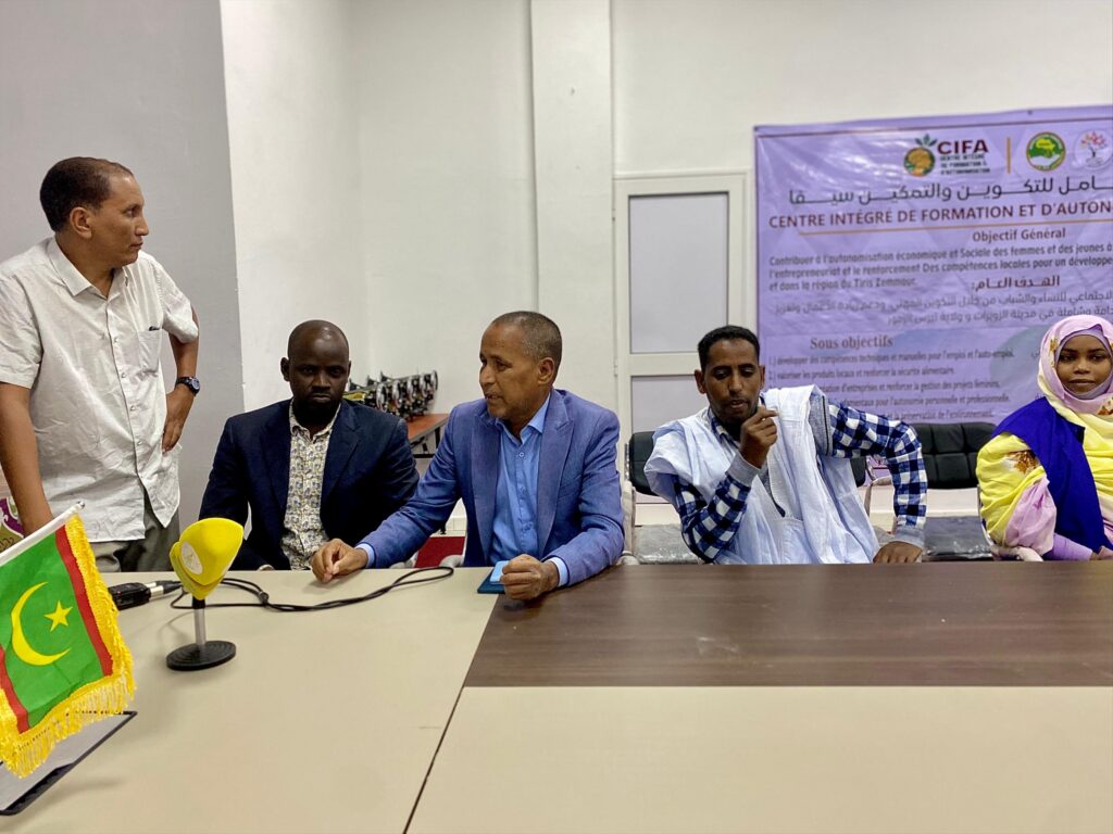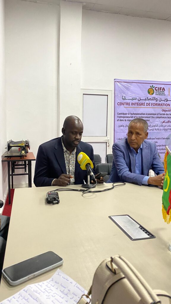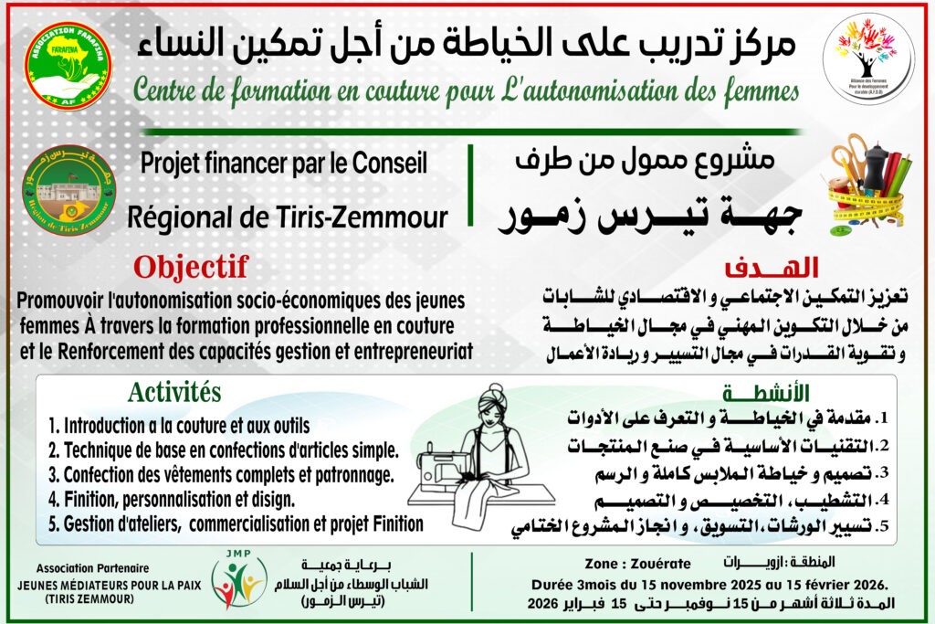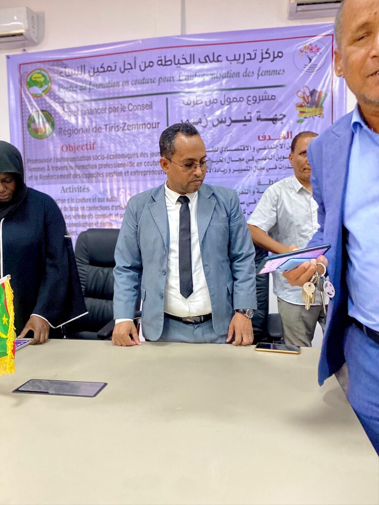 Zouerate, 17 novembre 2025Le 17 novembre 2025, la Direction du Conseil Régional de Tiris-Zemmour a accueilli la cérémonie officielle d’ouverture du Centre de formation en couture pour l’autonomisation des femmes, un projet financé par le Conseil Régional et mis en œuvre au profit de 30 jeunes femmes de Zouerate.L’événement s’est déroulé en présence du Conseiller du Wali, d’un représentant du Conseil Régional, du Délégation Régionale de la Culture, des Arts, de la Communication et des Relations avec le Parlement, délégation régionale l’Autonomisation de la Jeunesse, de l’Emploi, des Sports et du Service civique, ainsi que représentes du plat forme de la société civile et présidents et représentantes des organisations partenaires : l’Association Farafina, l’Alliance des Femmes pour le Développement Durable et les Jeunes Médiateurs pour la Paix.Dans son allocution, le Président de l’Association Farafina a souligné l’importance de cette initiative pour renforcer l’employabilité des jeunes femmes et leur offrir des compétences professionnelles adaptées aux besoins du marché. Les différents intervenants ont affirmé leur soutien à ce programme, rappelant son rôle essentiel dans la réduction du chômage, la lutte contre les inégalités de genre et la promotion de l’autonomie économique.Le moment fort de la cérémonie a été le lancement officiel des activités, effectué par la Conseillère du Conseil Régional qui, symboliquement, a activé une machine à coudre devant l’assistance, marquant ainsi l’ouverture du Centre.Ce projet propose un parcours de trois mois incluant des modules en couture, patronage, confection de vêtements, gestion d’ateliers et entrepreneuriat. Il constitue une étape majeure dans la dynamique régionale visant à renforcer la formation professionnelle et l’autonomisation des femmes à Zouerate